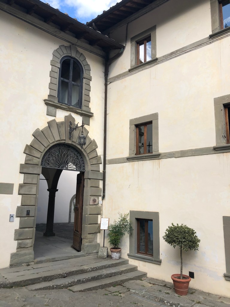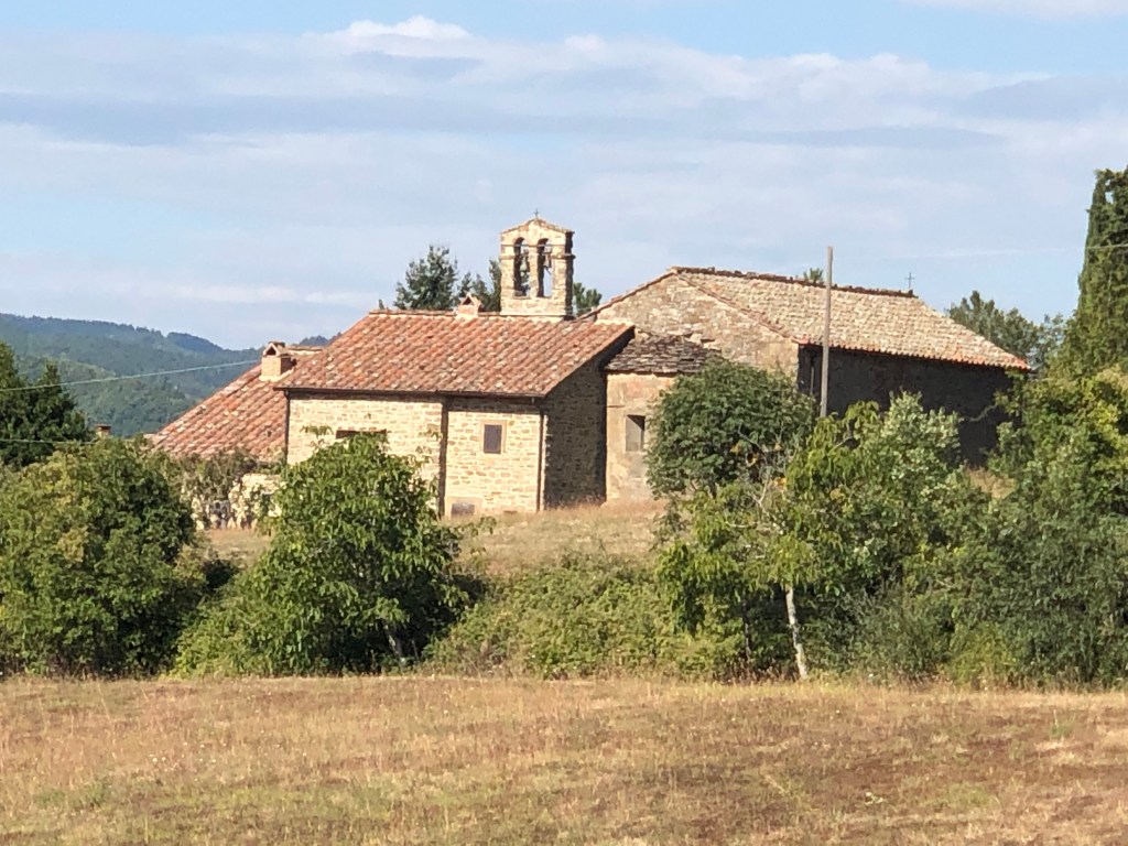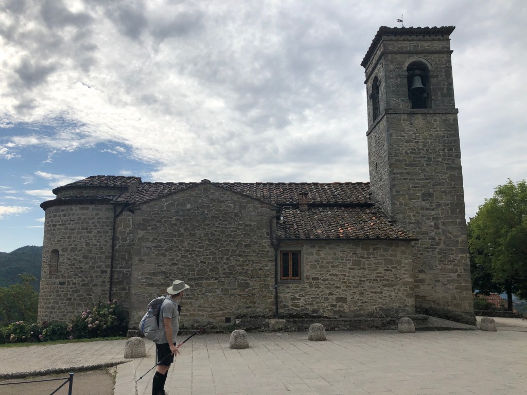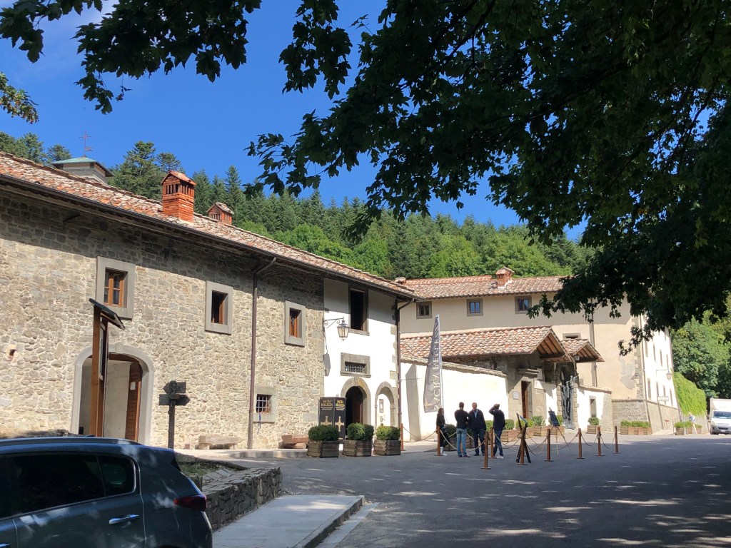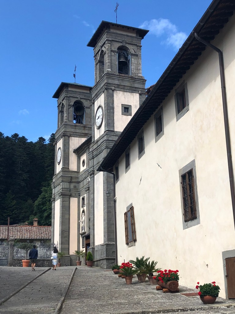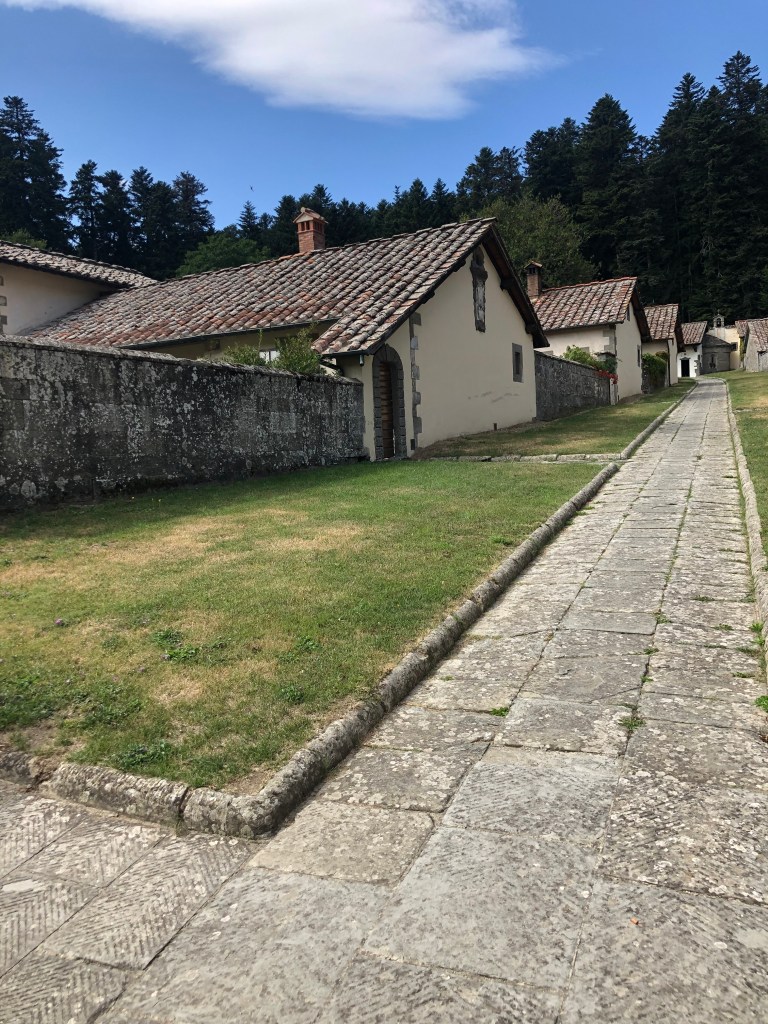 Irgendwann passierten wir den Croce Gaggi auf einer Höher von gut 1100m und nach einem weiteren Anstieg von 150m und einem sehr steilen Abstieg gelangten wir schließlich zur Einsiedelei. In dieser Einsiedelei hatte einst Franz von Assisi auf seinem Weg nach Rom verweilt. Berühmt wurde sie bereits durch den Gründer des Kamaldulenserordens, den Benedektinermönch Romuald, dessen Zelle wir in der Einsiedelei besichtigen konnten. Dieser Mönch hatte auch an unserem heutigen Zielort ein Gasthaus gegründet, aus dem ein großes Kloster erwuchs.