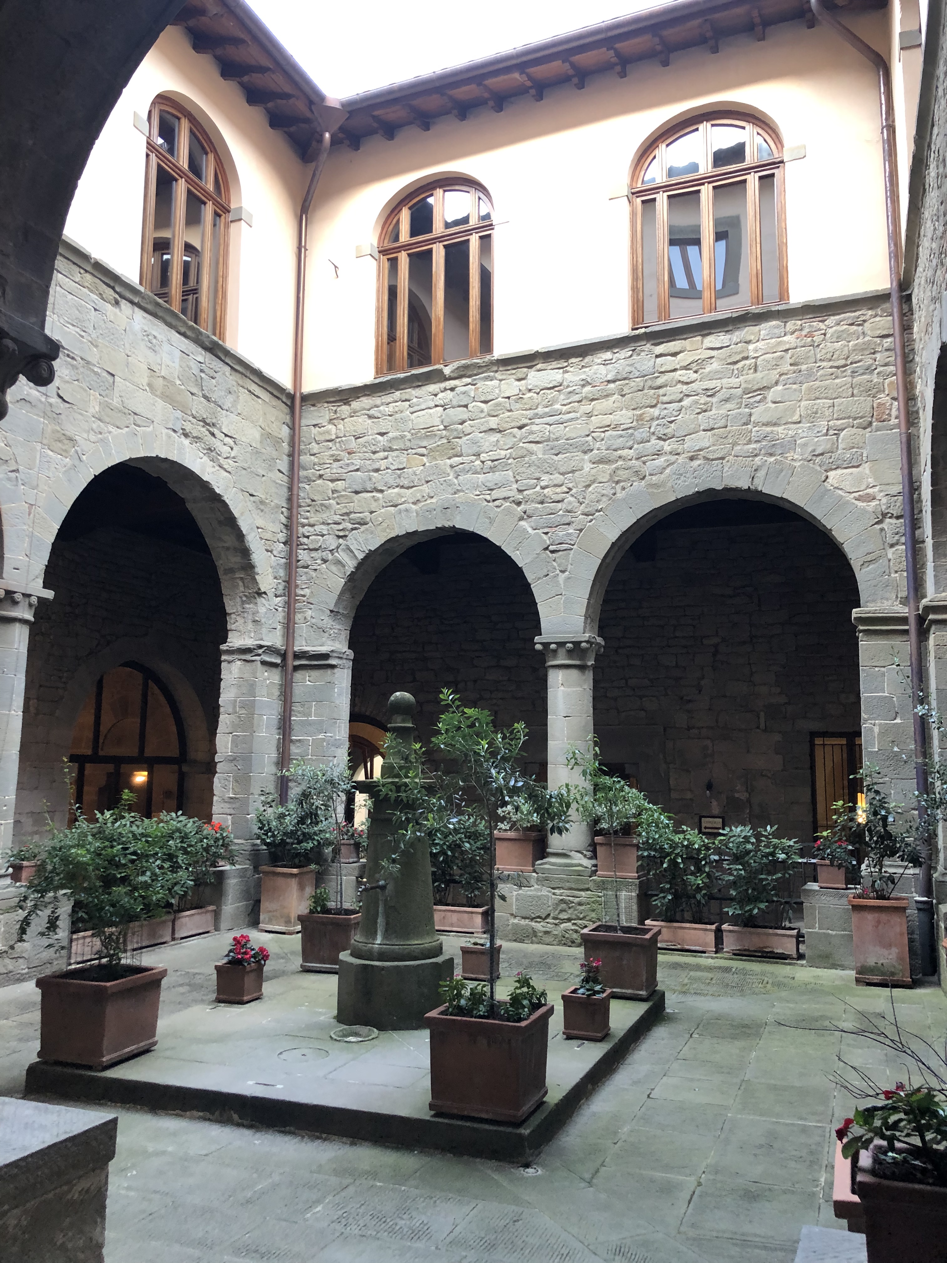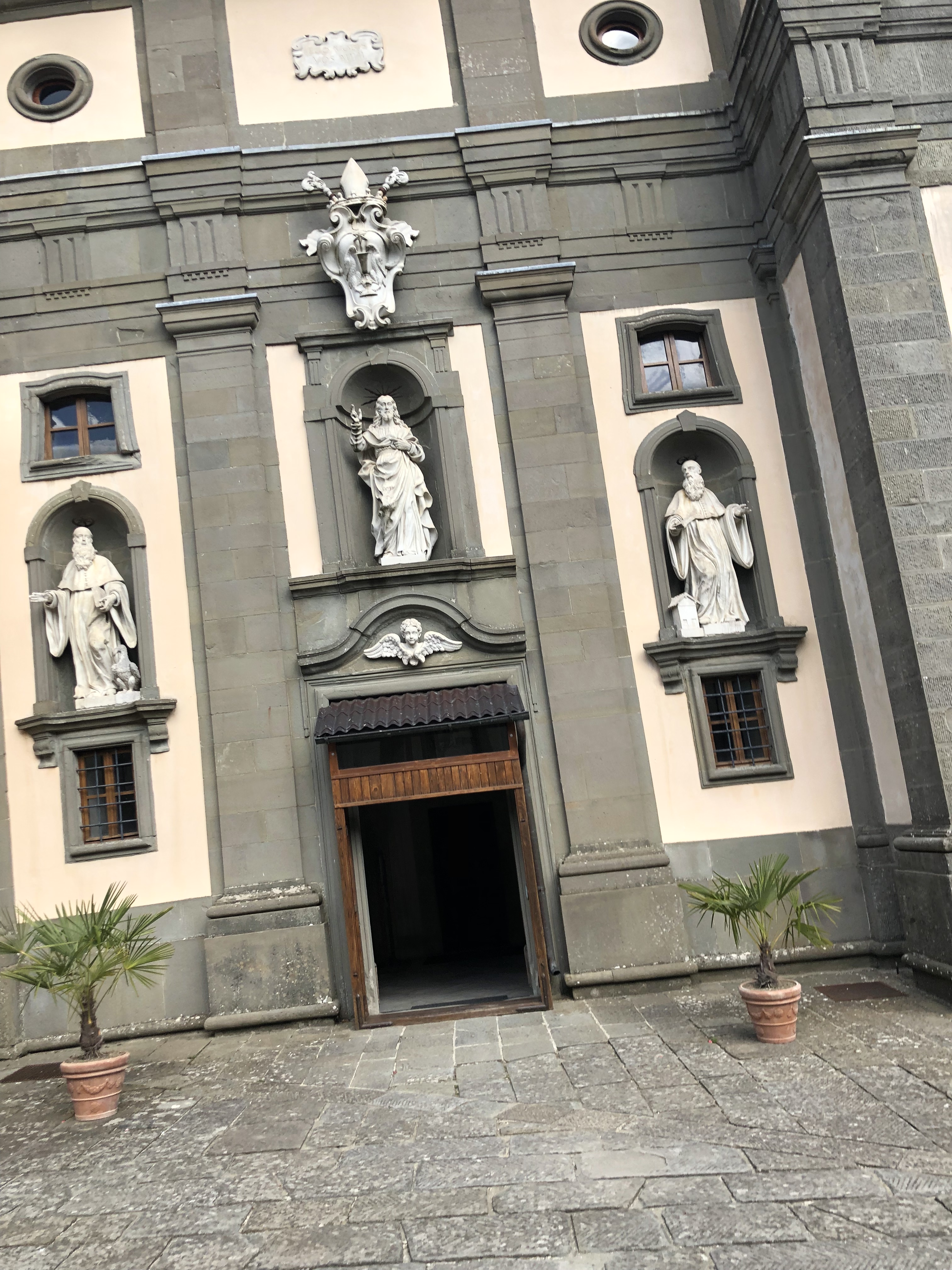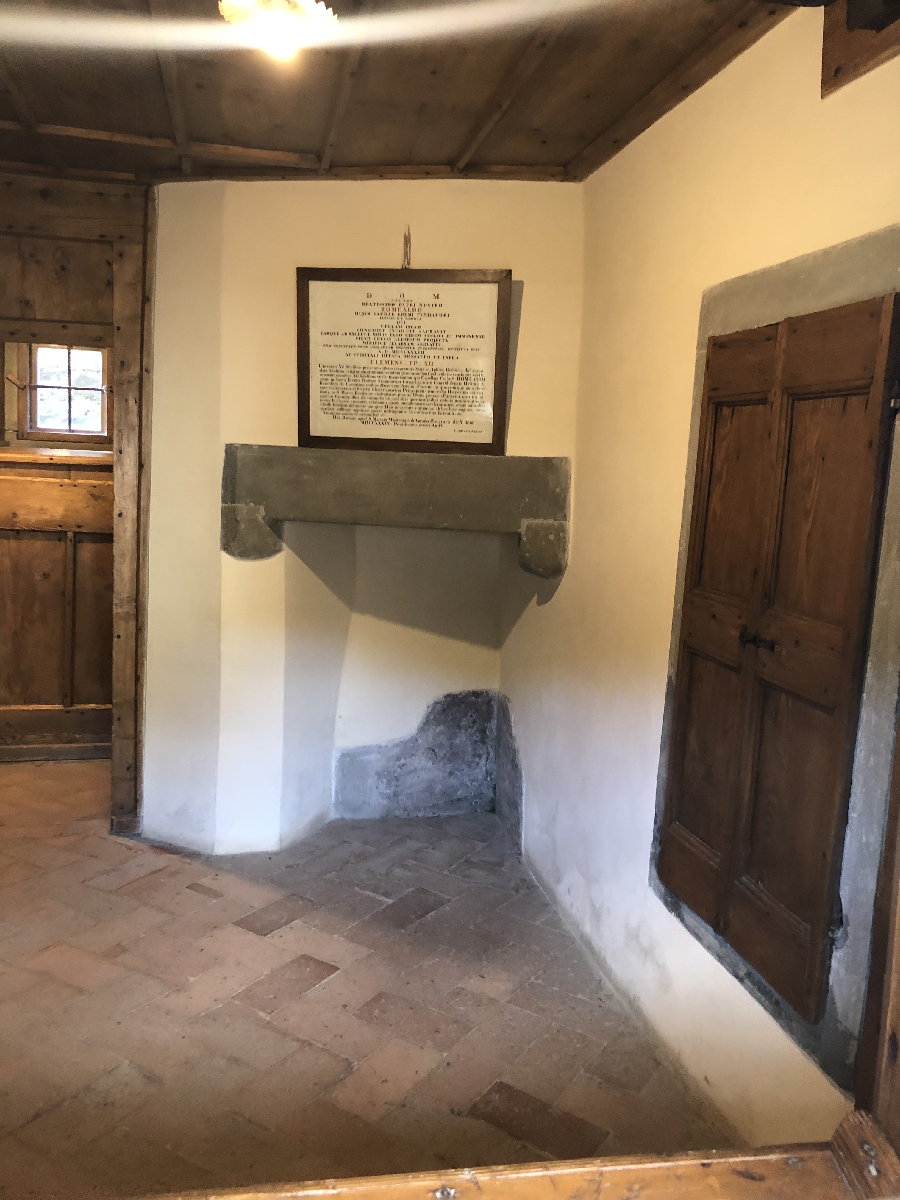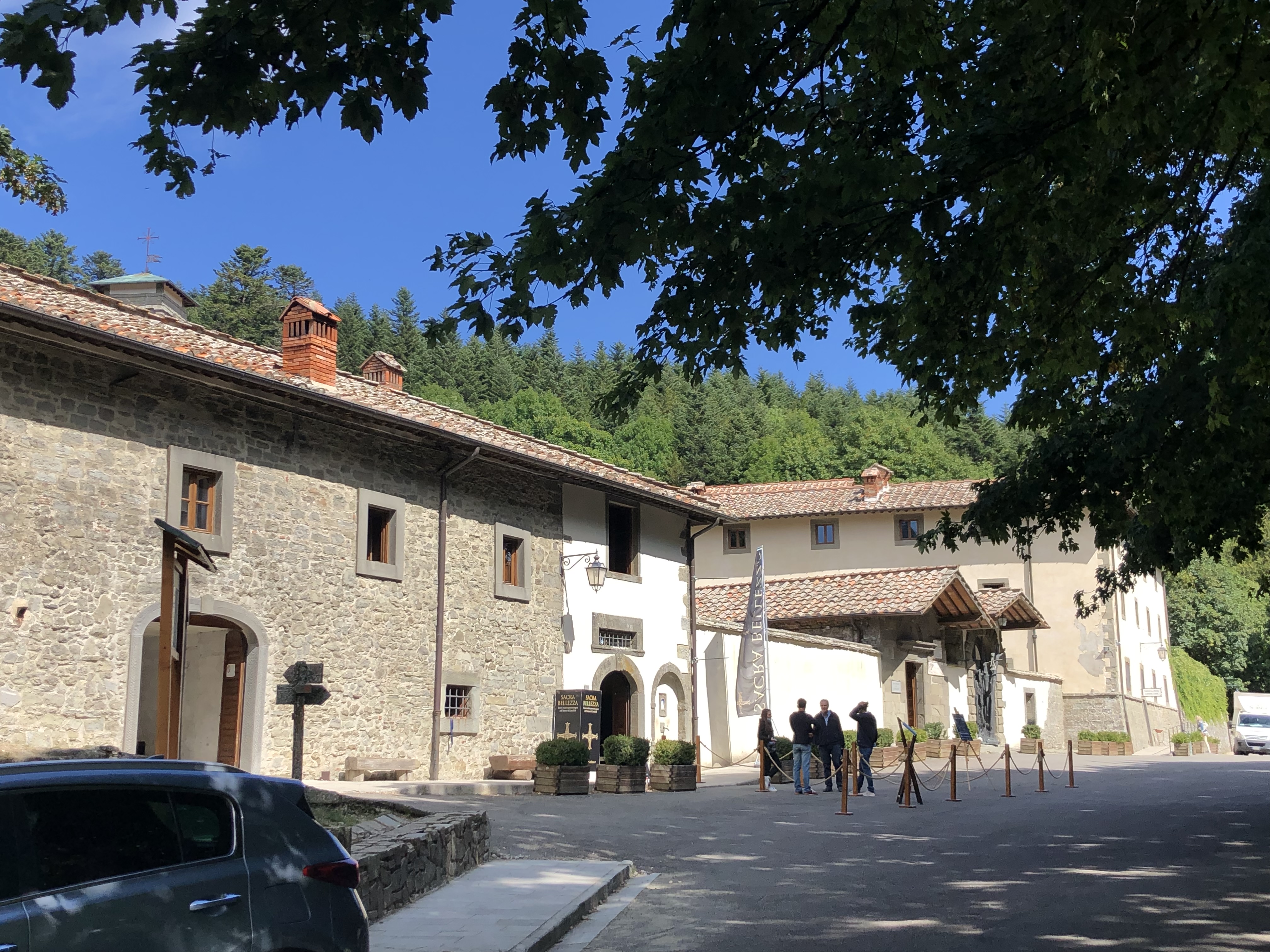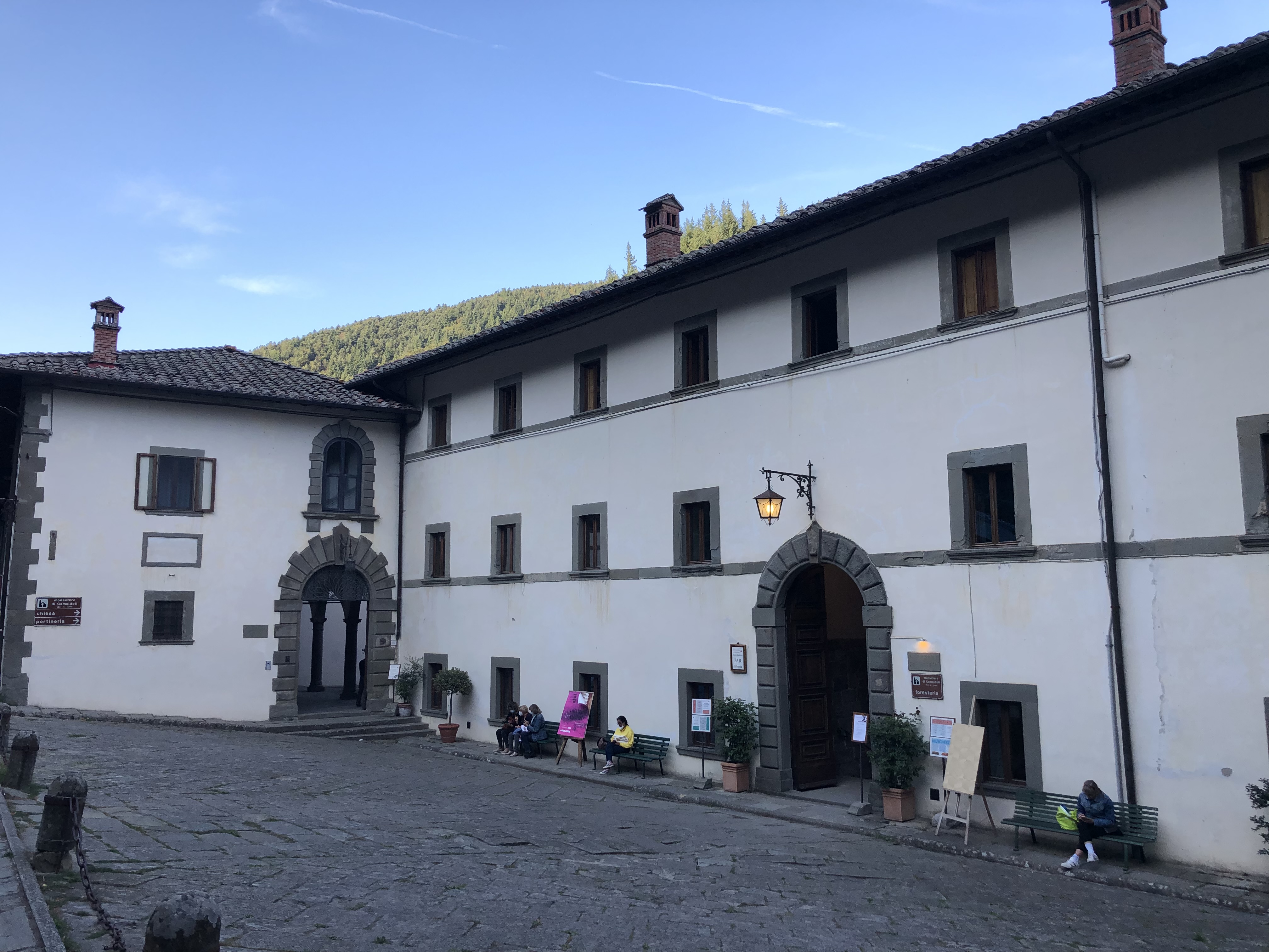 Irgendwann passierten wir den Croce Gaggi auf einer Höher von gut 1100m und nach einem weiteren Anstieg von 150m und einem sehr steilen Abstieg gelangten wir schließlich zur Einsiedelei. In dieser Einsiedelei hatte einst Franz von Assisi auf seinem Weg nach Rom verweilt. Berühmt wurde sie bereits durch den Gründer des Kamaldulenserordens, den Benedektinermönch Romuald, dessen Zelle wir in der Einsiedelei besichtigen konnten. Dieser Mönch hatte auch an unserem heutigen Zielort ein Gasthaus gegründet, aus dem ein großes Kloster erwuchs.
