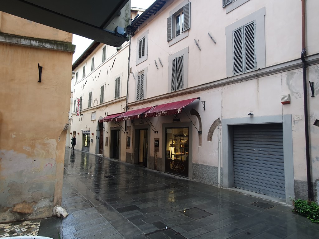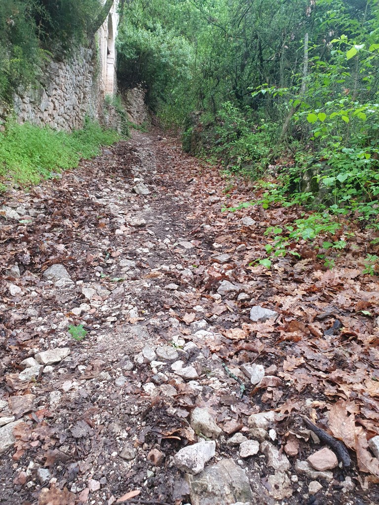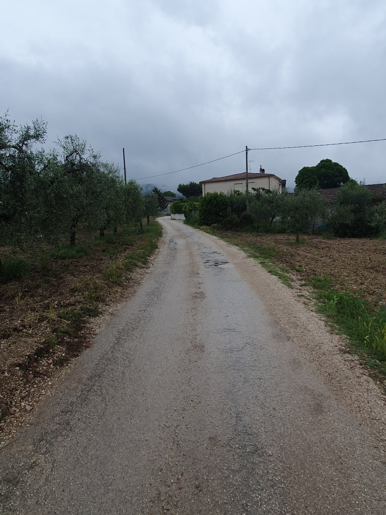 So etwas nennt man einen gebrauchten Tag. In den frühen Morgenstunden hörte ich schon das freundliche Rauschen des Regens. Zum Glück hörte der starke Regen auf und wir sind nach einem schnellen und einfachen Frühstück im leichten Nieselregen aufgebrochen. Der Weg führte durch Vororte, entlang stark befahrenen Straßen, und gleich beim loslaufen hatte ich starke Schmerzen im Knie. Diese Konstellation brachte mich gleich zum Start in eine schlechte Stimmung. Der Regen, die Autos, die Gischt, und jeder Schritt mit Schmerzen. Mit zusammengebissenen Zähnen ging es voran, und irgendwann hörte der Regen auf, und wir verliessen auch die Straße und gingen langsam in die Berge. Bergauf wurden die Schmerzen erträglich, Creme und Schmerzmittel taten ihr übriges. Die Strecke war wirklich schön, gut zu laufen, einige wenige kurze und steile Abschnitte. Es ging am Rande des Tales in Richtung der Stadt Trevi. Dort entschloss ich mich den Rest der Strecke mit dem Taxi zu machen. Nach 13 Km hatte ich genug, mein Ziel ist schließlich Rom. Dann lieber heute etwas kürzer treten. Martin ist die restliche Strecke noch gelaufen. Kurz nachdem ich im Taxi saß, fing es stark an zu Regnen. Dieser Regenschauer hat auch Martin erwischt, er war zum Glück nur von kurzer Dauer. Wir hatten noch einen schönen Abend. Erst haben wir ein verspätestes Mittagessen im Garten unserer Unterkunft eingenommen, mit kräftiger Unterstützung zweier Katzen. Anschließend gab es dann am Abend ein Abendessen zusammen mit anderen Pilgern in einer Pilgerunterkunft hier im Ort. Gekocht hatte eine nette alte Oma, Betreiberin des ortsansässigen Tabachi und Alimentari Ladens. Also der Mittelpunkt dieses 30 Seelenorts. So hat dieser gebrauchte Tag doch noch eine schönes Ende gefunden.