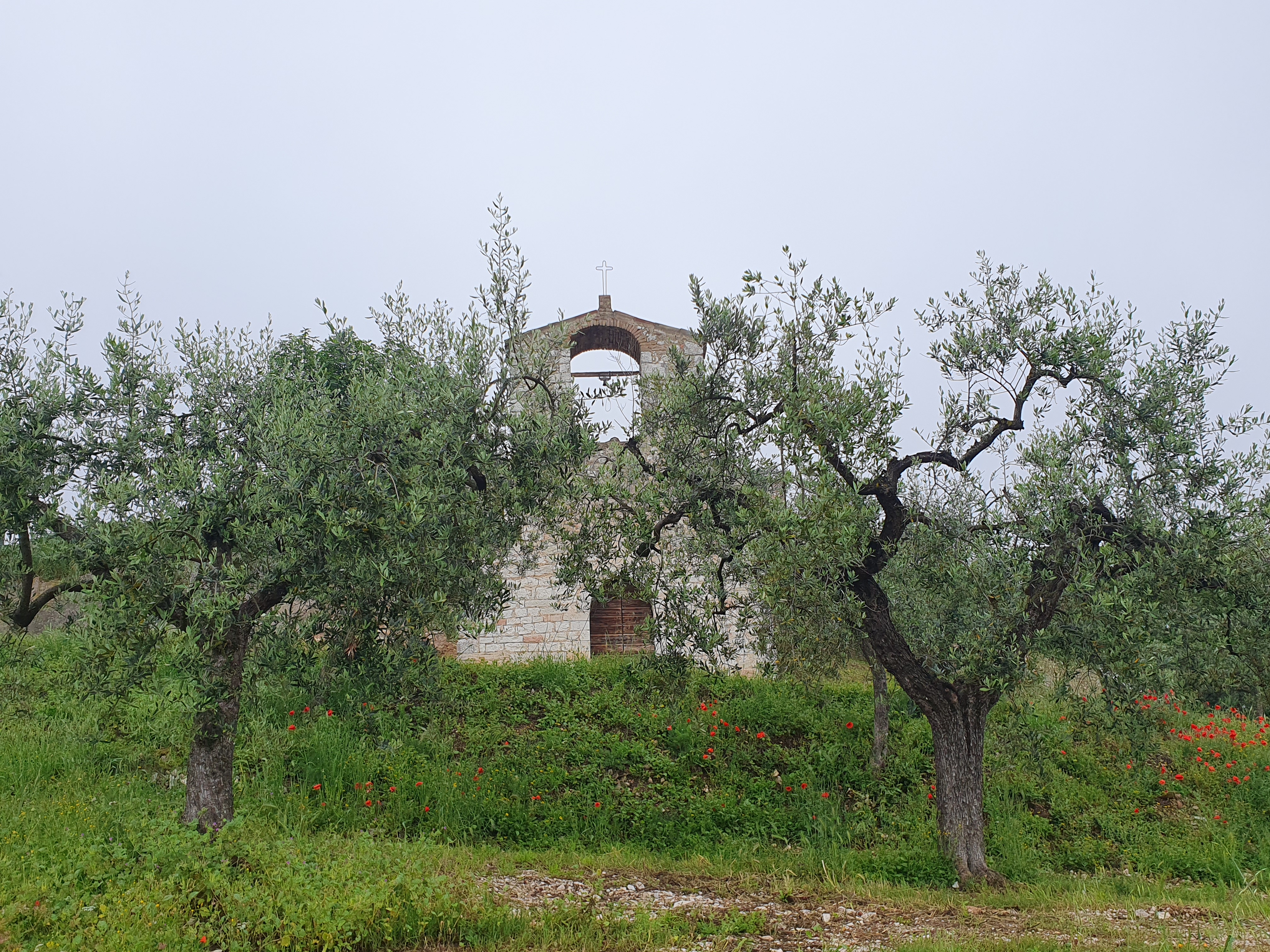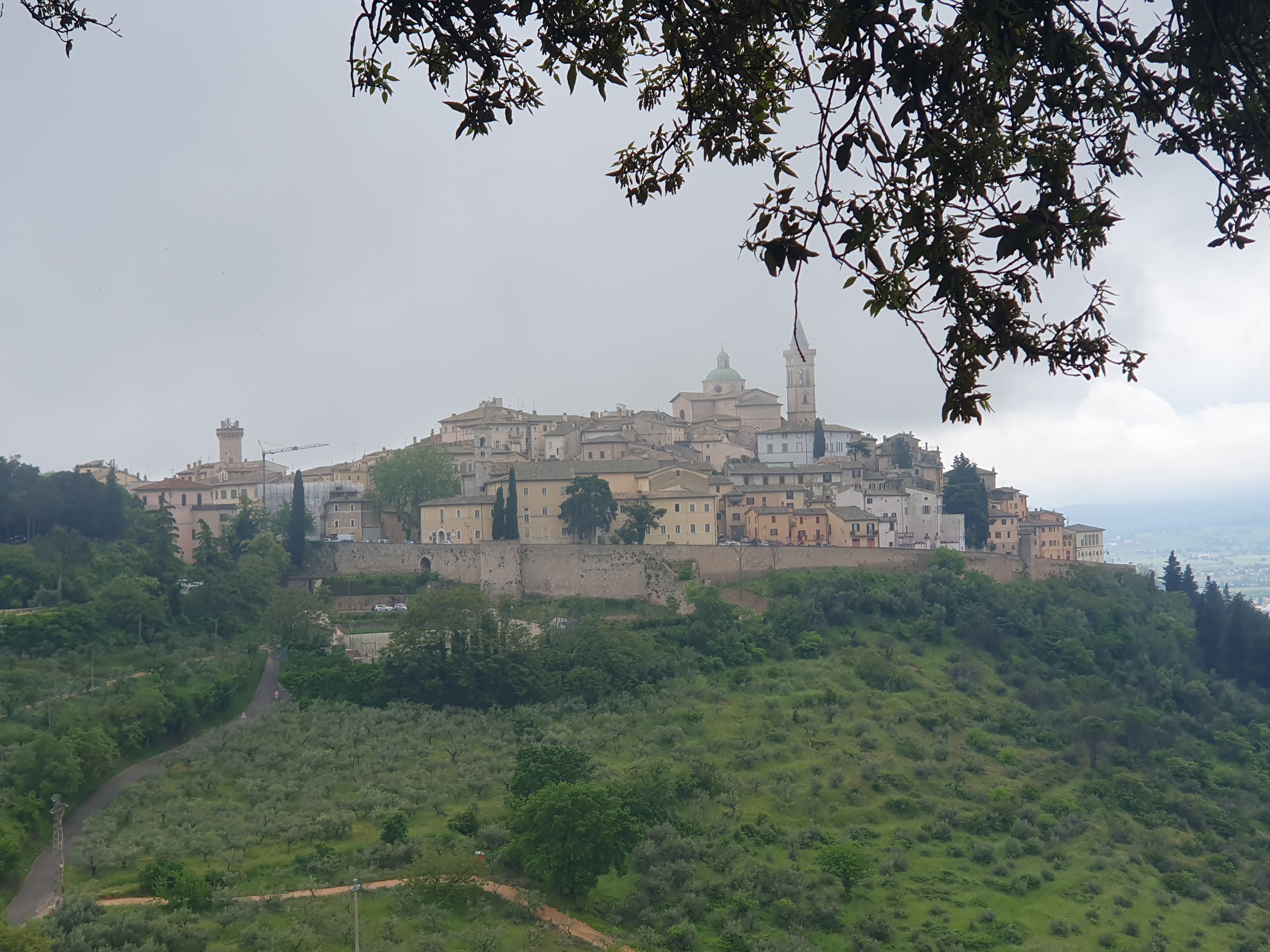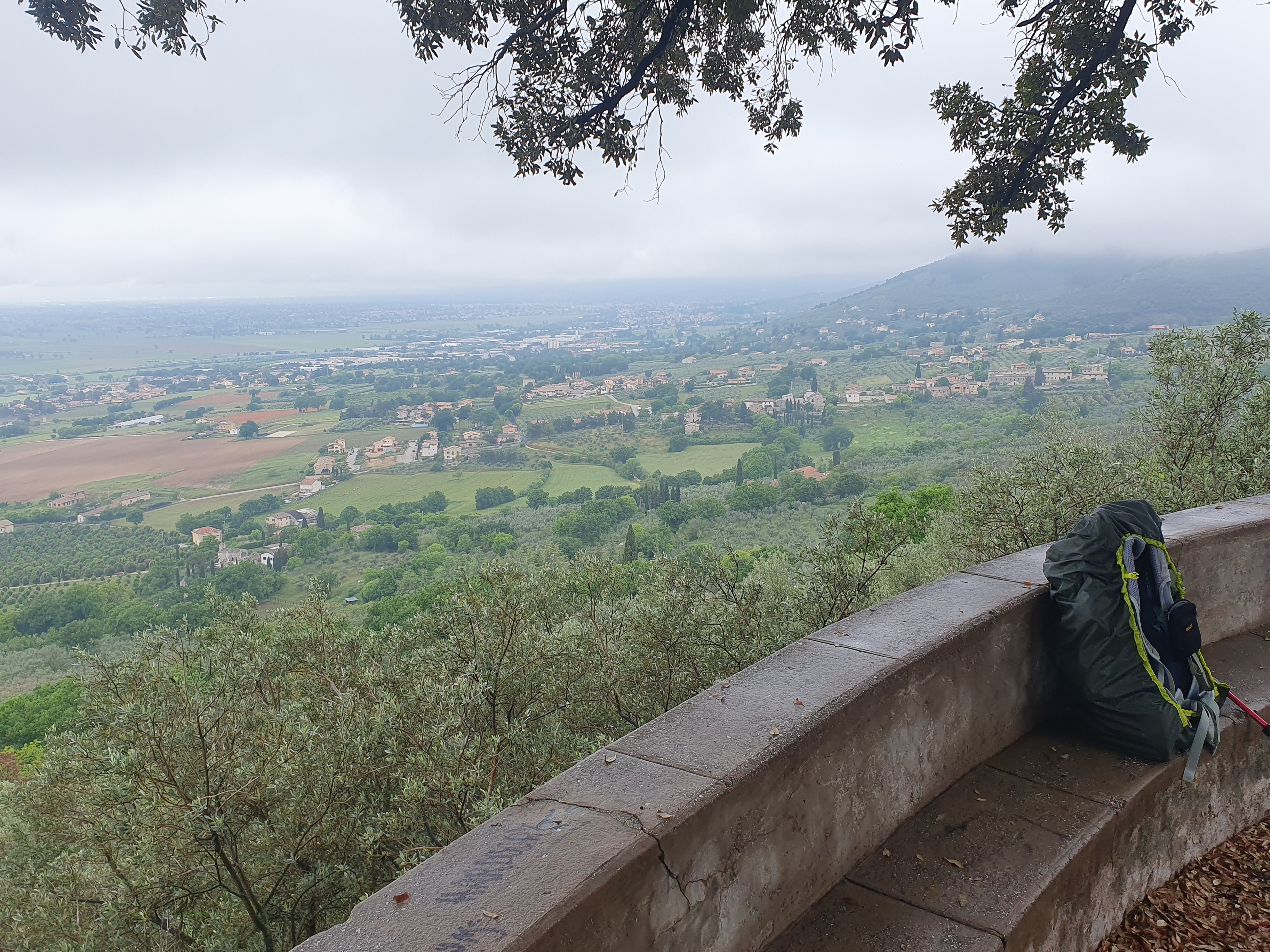 So etwas nennt man einen gebrauchten Tag. In den frühen Morgenstunden hörte ich schon das freundliche Rauschen des Regens. Zum Glück hörte der starke Regen auf und wir sind nach einem schnellen und einfachen Frühstück im leichten Nieselregen aufgebrochen. Der Weg führte durch Vororte, entlang stark befahrenen Straßen, und gleich beim loslaufen hatte ich starke Schmerzen im Knie. Diese Konstellation brachte mich gleich zum Start in eine schlechte Stimmung. Der Regen, die Autos, die Gischt, und jeder Schritt mit Schmerzen. Mit zusammengebissenen Zähnen ging es voran, und irgendwann hörte der Regen auf, und wir verliessen auch die Straße und gingen langsam in die Berge. Bergauf wurden die Schmerzen erträglich, Creme und Schmerzmittel taten ihr übriges. Die Strecke war wirklich schön, gut zu laufen, einige wenige kurze und steile Abschnitte. Es ging am Rande des Tales in Richtung der Stadt Trevi. Dort entschloss ich mich den Rest der Strecke mit dem Taxi zu machen. Nach 13 Km hatte ich genug, mein Ziel ist schließlich Rom. Dann lieber heute etwas kürzer treten. Martin ist die restliche Strecke noch gelaufen. Kurz nachdem ich im Taxi saß, fing es stark an zu Regnen. Dieser Regenschauer hat auch Martin erwischt, er war zum Glück nur von kurzer Dauer. Wir hatten noch einen schönen Abend. Erst haben wir ein verspätestes Mittagessen im Garten unserer Unterkunft eingenommen, mit kräftiger Unterstützung zweier Katzen. Anschließend gab es dann am Abend ein Abendessen zusammen mit anderen Pilgern in einer Pilgerunterkunft hier im Ort. Gekocht hatte eine nette alte Oma, Betreiberin des ortsansässigen Tabachi und Alimentari Ladens. Also der Mittelpunkt dieses 30 Seelenorts. So hat dieser gebrauchte Tag doch noch eine schönes Ende gefunden.