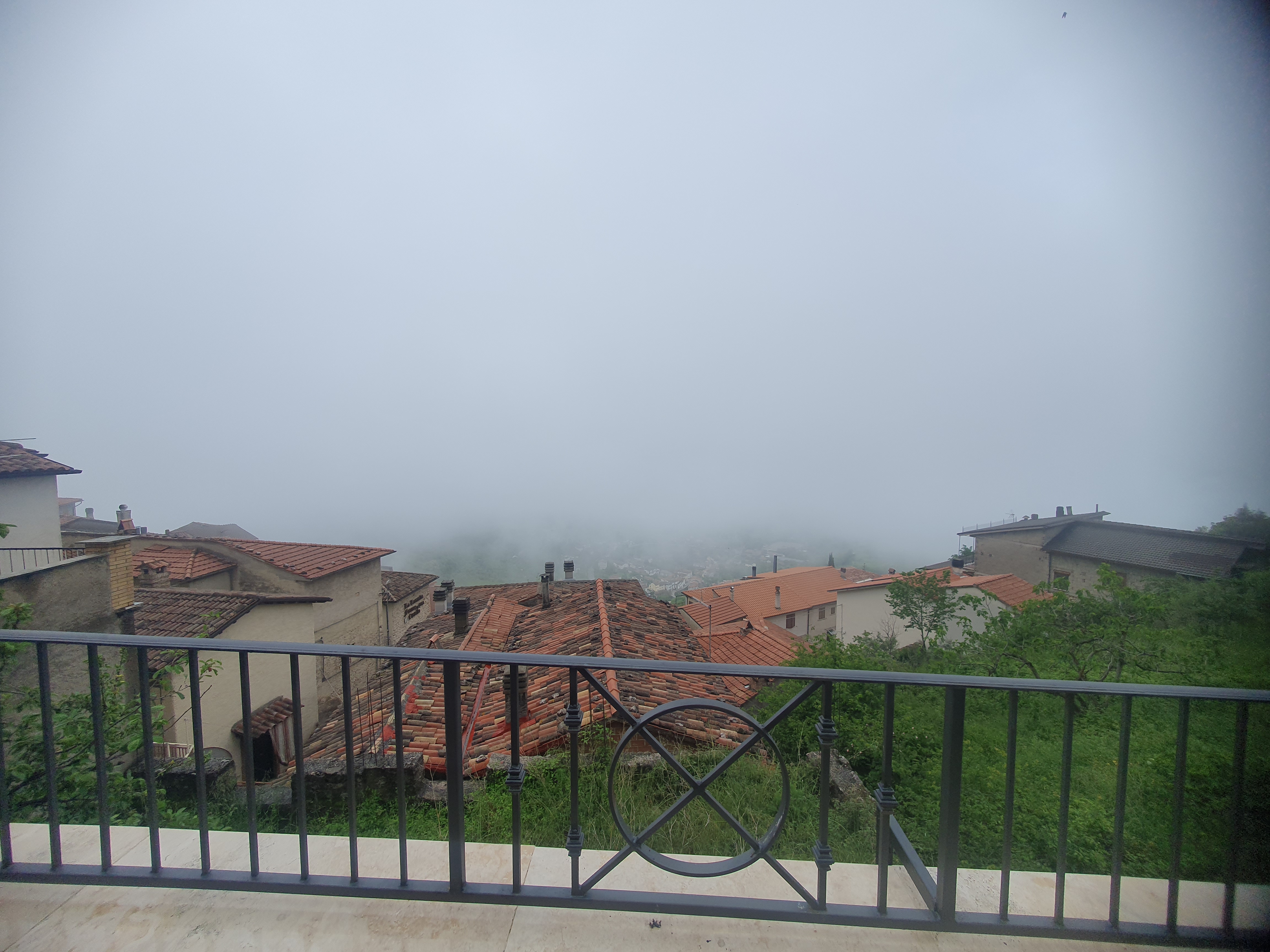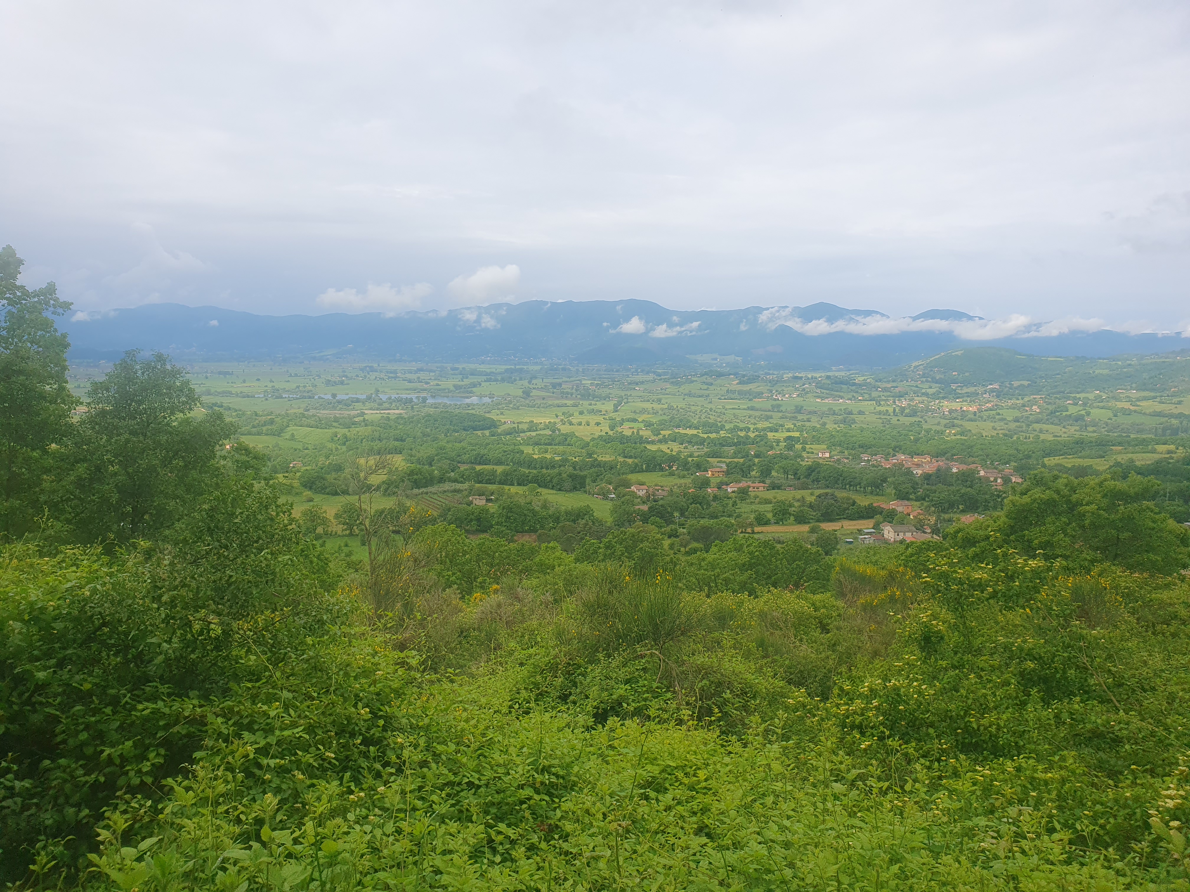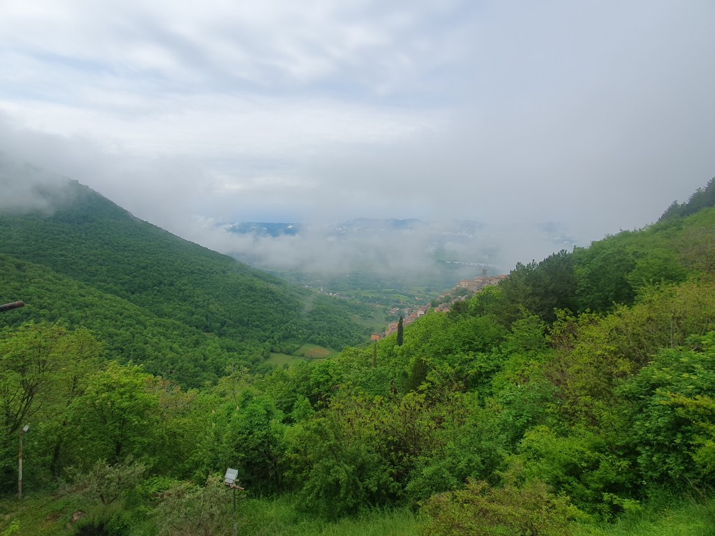Und warum? es war bewölkt mit leichten Regen, das Tal war in Wolken gehüllt. Also nicht was einem normalerweise vor die Tür treibt. Und gleich am Anfang stand auch noch eine schöne Steigung ins Haus, hoch zum Sanctuarium. Da trödelt man doch gerne ein wenig herum. Aber irgendwann einmal muss es ja mal losgehen. Also gleich im Ort die steile Straße hinauf bis zum Sanctuarium. Oben angekommen war die Sicht in das Tal auch schon besser, und der Regen hatte einmal Pause. Von dort ging es dann wieder runter, und der Weg folgte wunderschön dem Berghang. Nach 8 Kilometer kamen wir dann in einen Ort. Wir stiegen dem Hang hinunter in den neuen Ortsplatz, um gleich über unzählige Treppen steil in den alten Ortskern zu gelangen. Zur Erinnerung: die Orte sind hier öfters schön an den Berg gebaut.