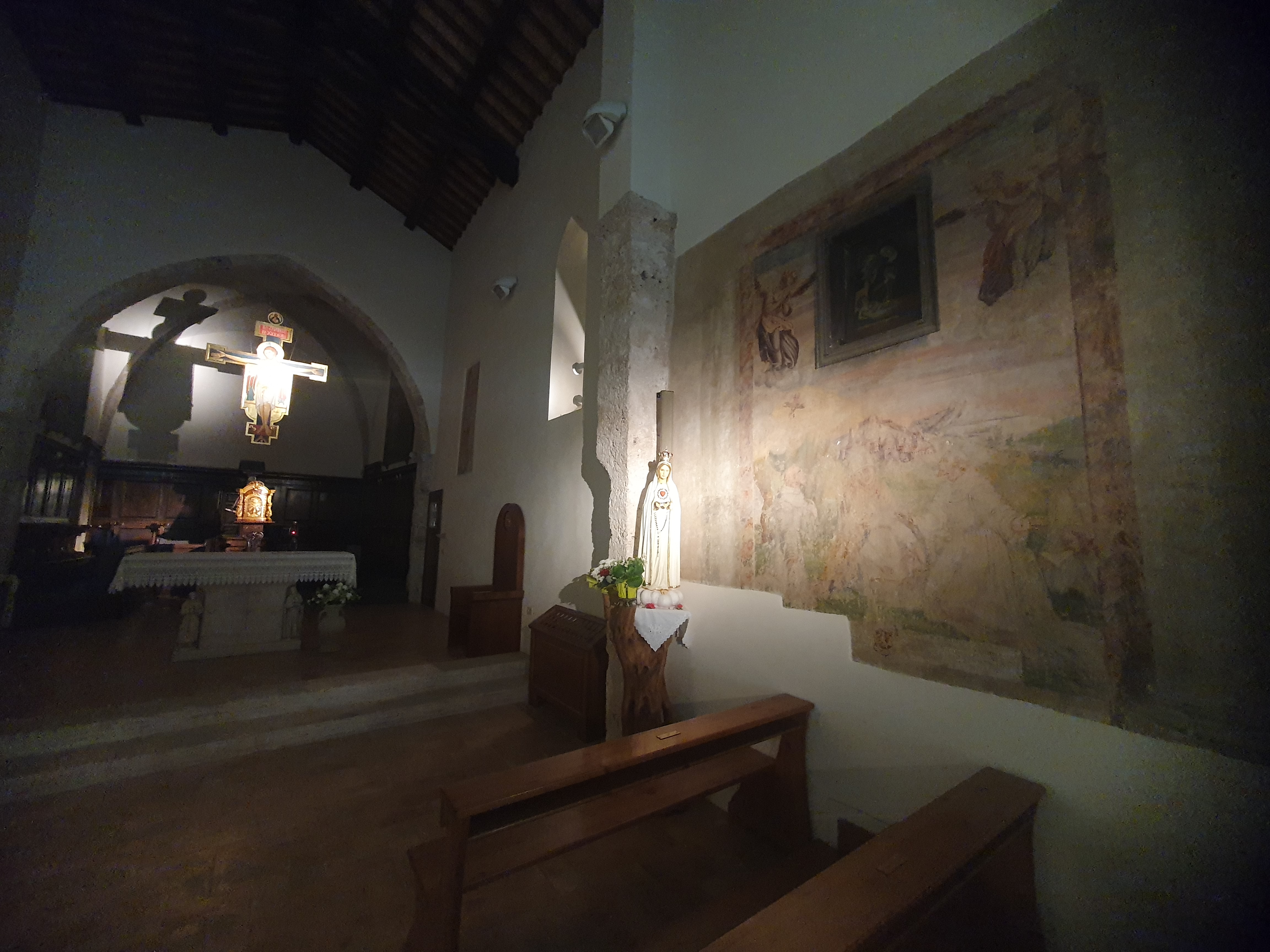Aber auch das war irgendwann einmal schweißtreibende Geschicht, und der Weg ging mit leichtem auf und ab weiter. Im nächsten Ort dann überkam Martin ein Hungergefühl, und im ansässigen Alimentari kaufte er sich ein Panini. Und dann kam der Hund ins Spiel. Er kam die Straße herunter, schaute uns an, und folgte uns die nächsten ca. 10 Kilometer bis nach Rieti hinein. Zwischendurch gab er sich ein Gastspiel mit anderen Hunden, welche es heute reichlich am Wegesrand gab. Er schaute mal in verschiedene Grundstücke, aber verlässlich war er danach wieder bei uns. Martins Gedanken gingen irgendwann nur noch darum; was machen wir mit dem Hund. Selbst einen Namen hatten wir schon. Diverse Überlegungen während des Weges ergaben schlußendlich: Don Camillo. Weil er genau so große Augen hat. Selbst eine längere Pause in einer kleinen Kirche, wo unser Hund die Gesellschaft von weiteren 5 Hunden genoss, hielt Ihn nicht davon ab uns zu folgen. Wir waren schon ca. 300 Meter gegangen, als er plötzlich wieder bei uns war. Wir kamen Rieti immer näher, und mein pragmatischer Ansatz wäre gewesen: ich hätte ihn an der Hotelreception abgegeben.