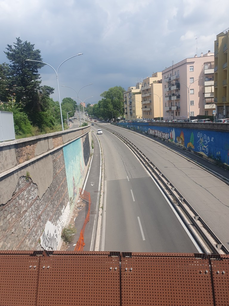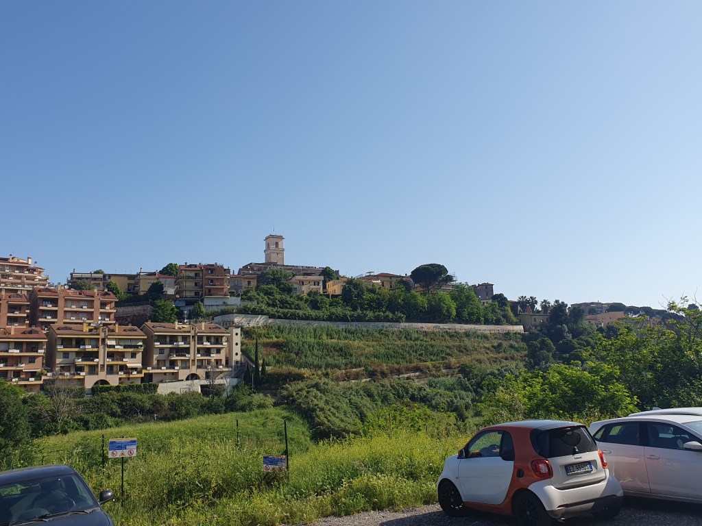 Irgendwann verließen wir das Naturschutzgebiet, und die Stadt begann. Die erste Bar und Gelateria war unsere. Es ging dann weiter in die Stadt, und je weiter wir kamen, desto mehr Verkehr gab es, desto dichter und höher wurden die Häuser. Waren die Tage vorher von hohen Bergen und grünen Aussichten geprägt, gab es nun nur noch hohe Häuser, Straßen und Autos. Unser Ziel für heute war Monte Sacro, ein Vorort von Rom. Und das Hotel war ein seelenloses Businesshotel. Kein Vergleich mehr mit den hübschen Orten vorher, den niedlichen Unterkünften.