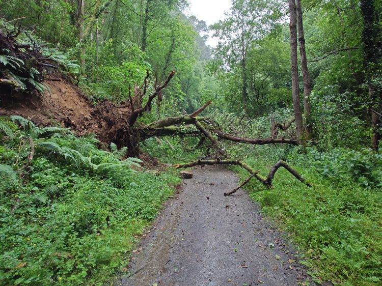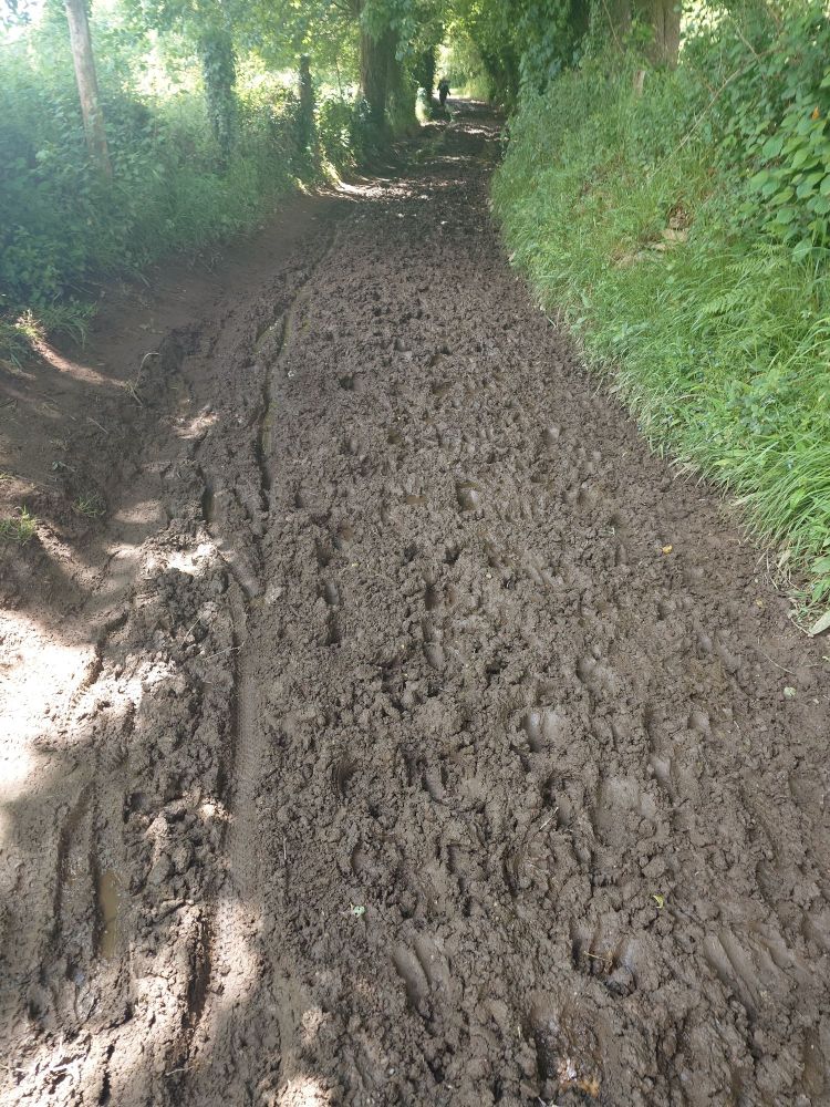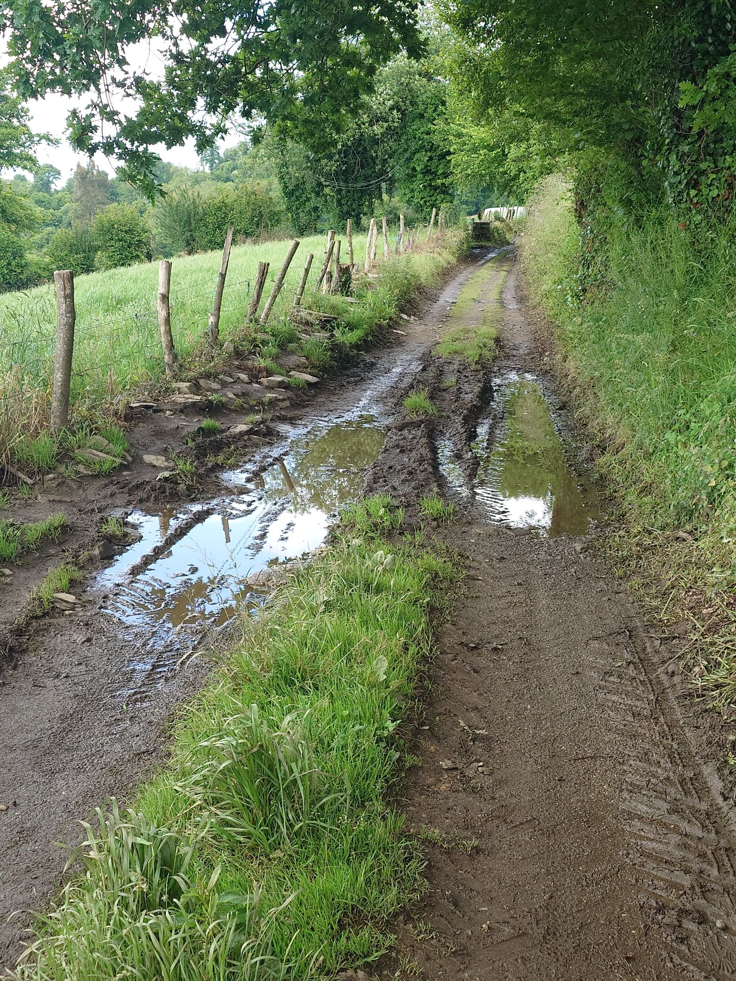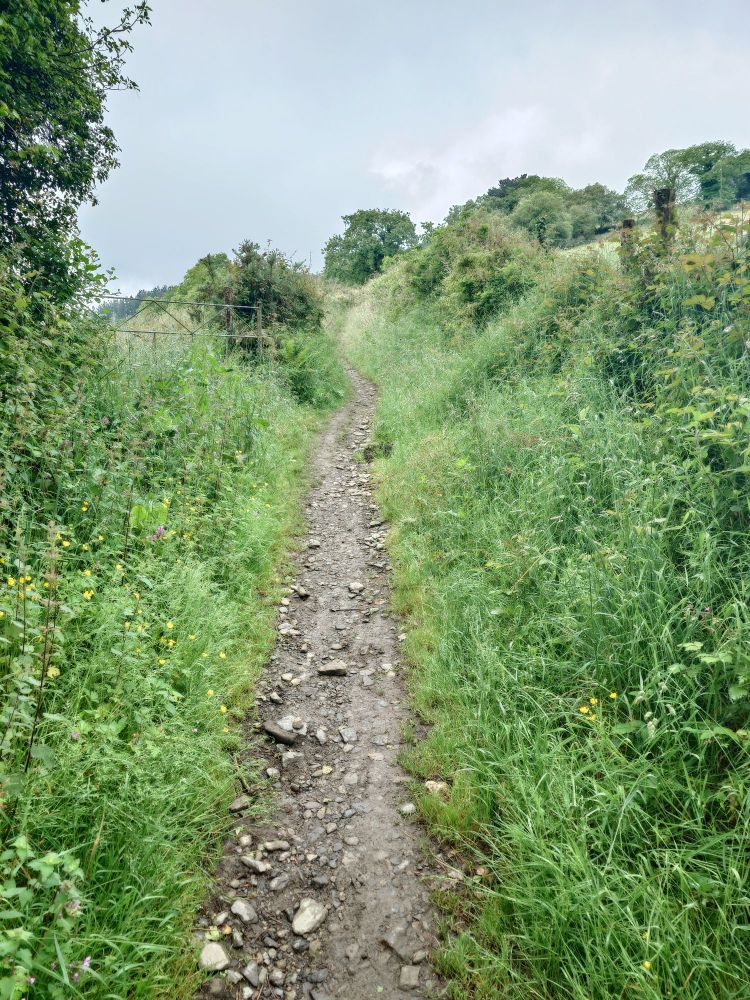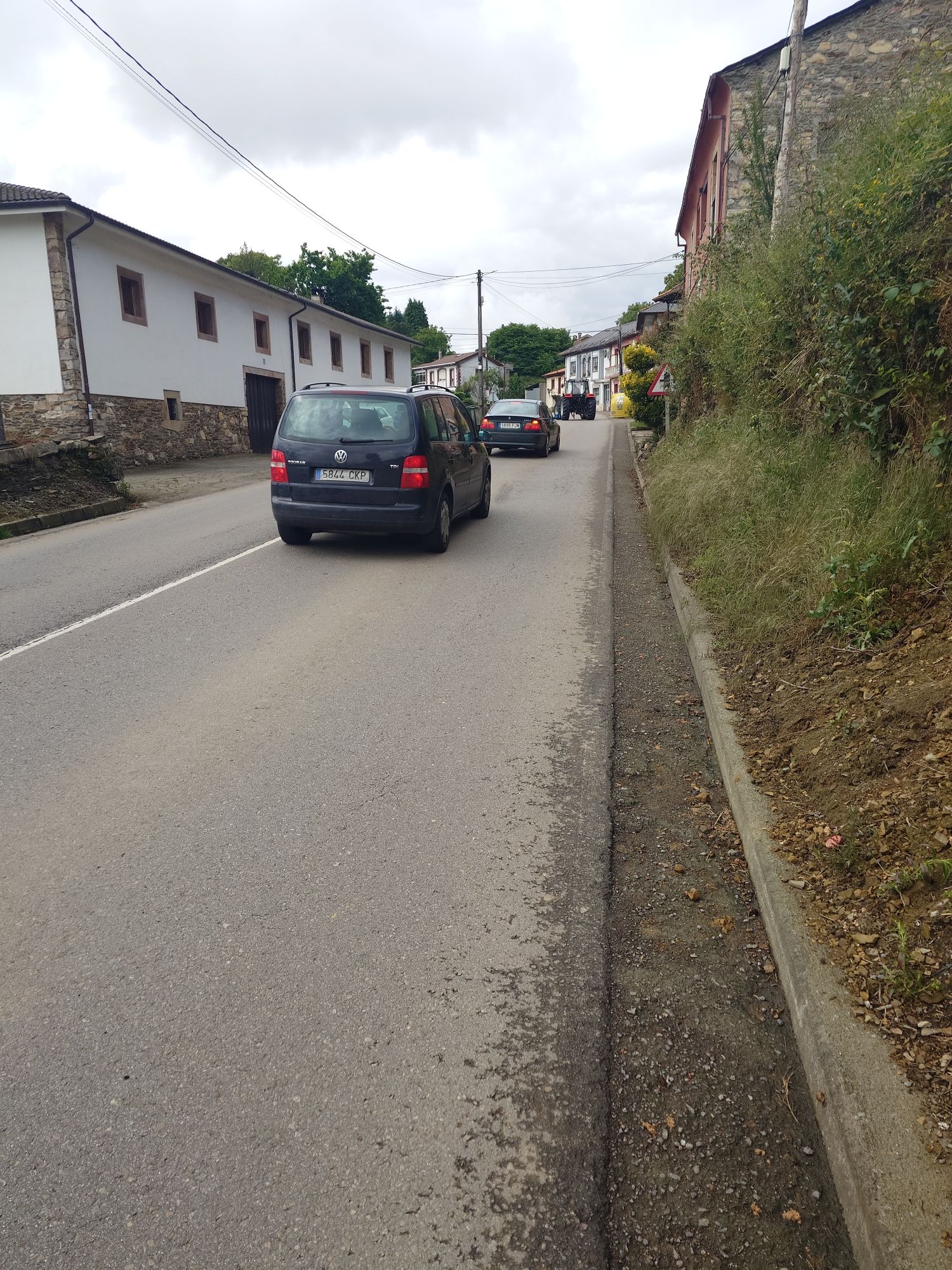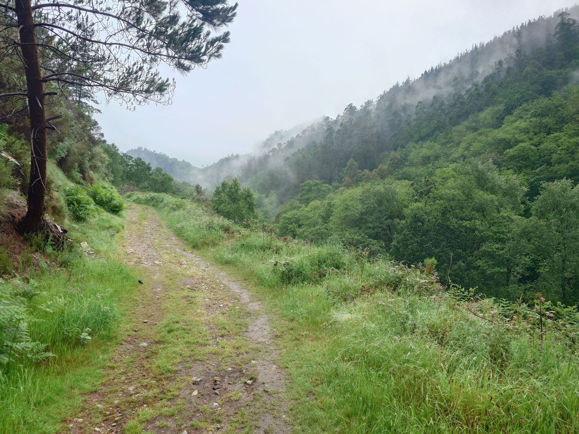 Der Weg ging am Anfang lange bergauf, um sich dann in einem stetigen Auf- und Ab durch die Landschaft zu schlängen. Es gab kurze, sehr schlammige Abschnitte, und auf der Strecke gab nur sehr wenige Möglichkeiten Rast zu machen. Eigentlich gab es ab Kilometer 8 bis nach Tineo keine Plätze. Der Weg war eng begrenzt durch Zäune, es gab feuchte Hohlwege durch Wälder, und überall hohes nasses Gras. Da meine Beine sich langsam verkrampft haben, habe ich mich dann auf einen Camino-Wegweiser gesetzt. Geht auch.