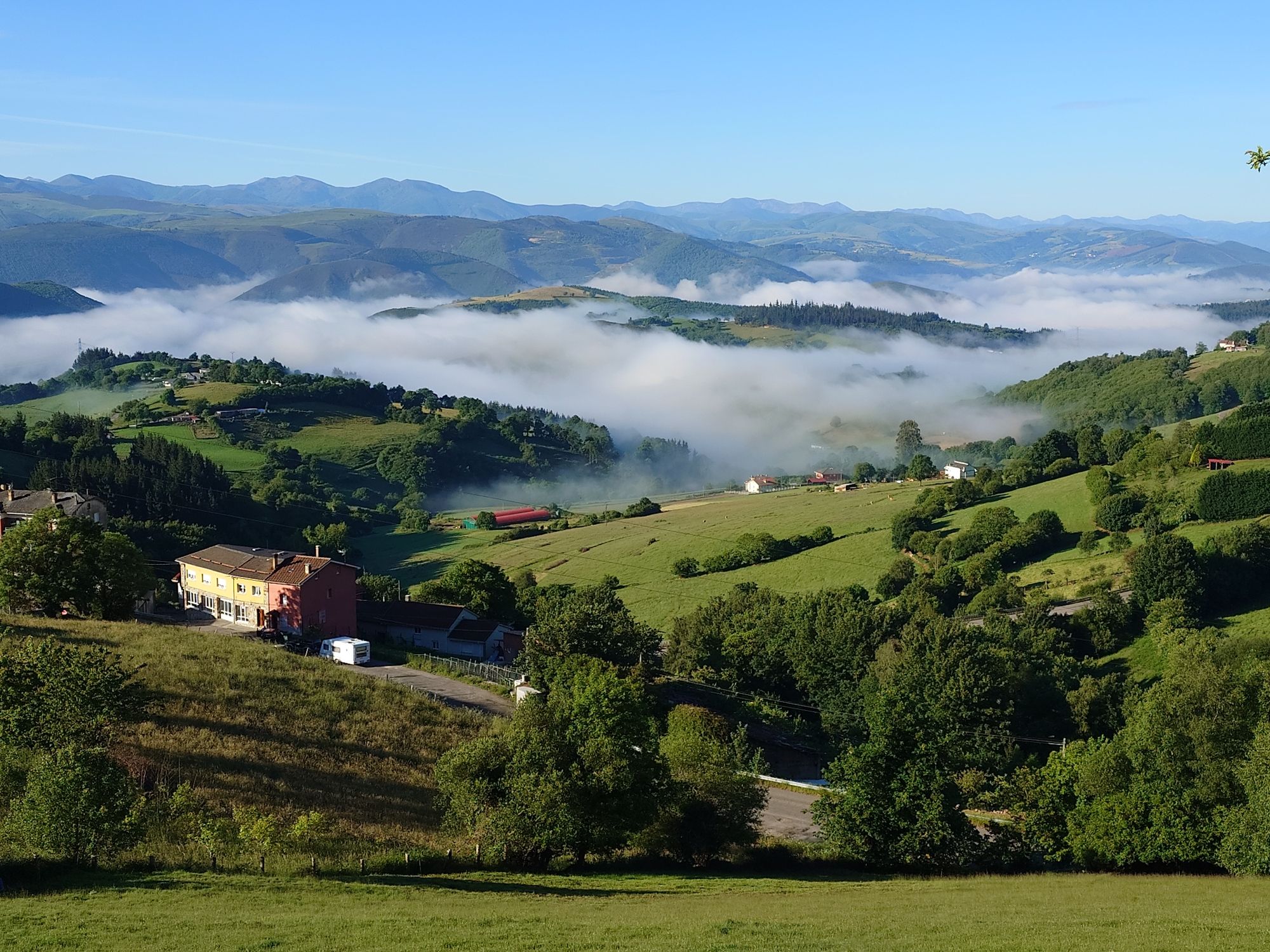 Der Start in den Tag heute war grandios. Blauer Himmel und Sonnenschein, dazu eine herrliche Landschaft. Das konnte auch nicht der längere Anstieg gleich von Tineo aus trüben. Im Gegenteil, schnell war ich auf Höhe und konnte herliche Aussichten geniessen. Wie auch gestern schauten mir diverse glückliche Kühe zu, wie ich schnaufend den ein oder anderen Anstieg machte. Bin ich gestern mit trüben Wetter und leichtem Regen gestartet, war es heute genau umgekehrt. So gegen Mittag zog sich der Himmel zu, und es wurde kühler und windiger. Unterwegs habe die Frau aus Toledo wieder getroffen. Sie erzählte mir das es eine gute Alternative für die morgige Route gibt. Es gibt zwei Möglichkeiten, die eine Route führt durch das Tal und ist besonders bei schlechten Wetter zu empfehlen. Die andere Route führt einsam über einen Berg, die Route Hospitalo. Das ist auf dem Primitivo die Königsetappe. Entscheidet man sich für die Hospitaloroute, wäre die heutige Etappe kurz, nur ca. 15 Kilometer. Und die morgige Strecke dafür länger, so ca. 27 Kilometer. Es gibt nun aber die Möglichkeit, die Talroute noch ein wenig zu gehen, in Colinas zu übernachten, um dann über einen Seiteneinstieg auf die Hopitaloroute zu kommen. Das verkürzt die morgige Strecke um gut 4 Kilometer. Diese Variante habe ich gewählt, ich bin gespannt wie morgen der Seiteneinstieg ist. Die Herberge hier ist auf alle Fälle gut. Neu gebaut, moderne 6-Bett Räume mit eigenem Badezimmer und Dusche.