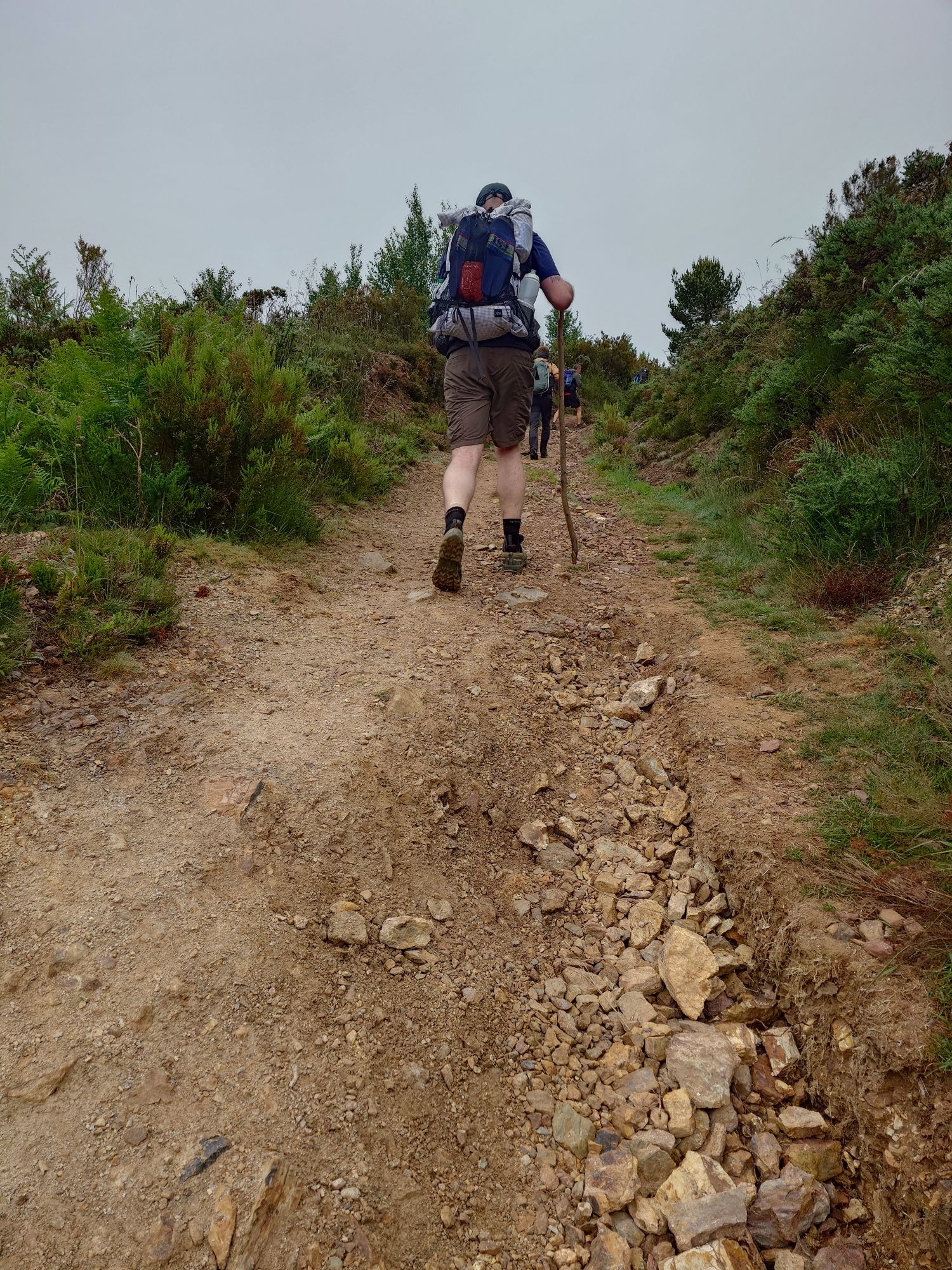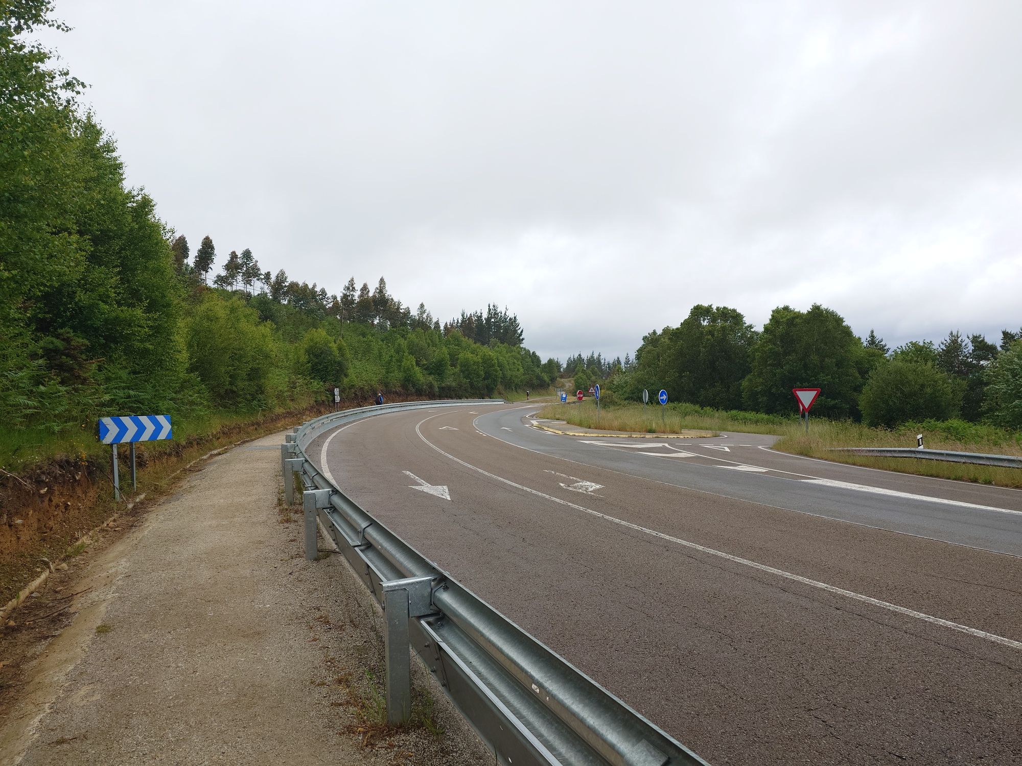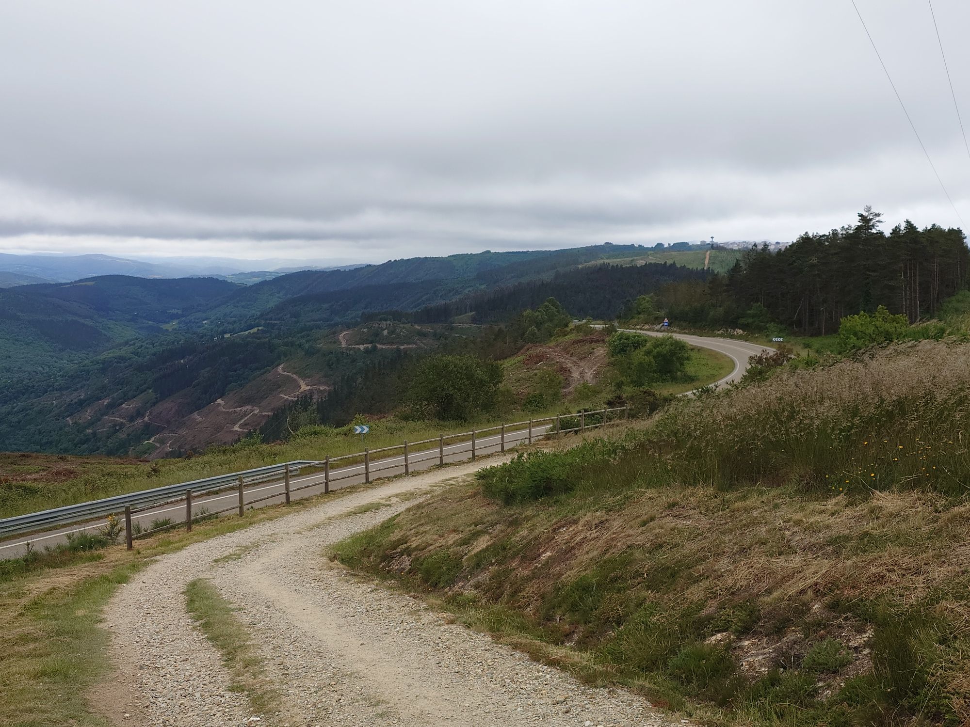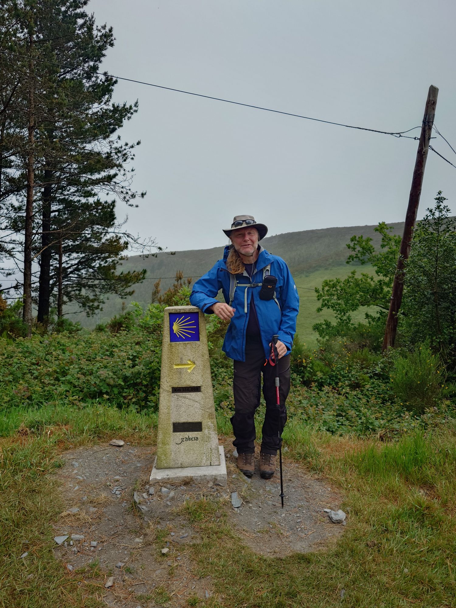 Die Pilgerherberge gestern war eine gute Wahl. Es gab ein 4-Bett Zimmer mit eigenem Badezimmer. Meine Bettnachbarn waren die mir schon gut bekannten Australier und der Engländer. Zusammen haben wir den Nachmittag und auch den Abend verbracht. Heute Morgen ging es um 0730 Uhr los. Auch in dieser Unterkunft gab es kein Frühstück, aber zum Glück nur wenige hundert Meter entfernt gab eine Bar. Zufälligeweise genau die Gleiche in der wir gestern Abend unser Diner hatten. Gut gestärkt ging es in den Tag. Höhepunkt heute war die Überquerung der Landesgrenze zwischen Asturien und Galicien. Die liegt auf halbem Wege auf ca. 1100 Metern. Dazu ging der Weg gleich von Beginn an stetig bergauf. Und wie auch schon die anderen Tage wurde es dort oben ziemlich kalt, windig und nass. Gleich nach der Überquerung gab es eine Bar, in die ich mich hineingesetzt habe. Es brannt ein Feuer im Kamin, ich habe einen Kaffee getrunken und ein Sandwich gegessen. Ich bin aus der warmen Bar raus, es war kalt, windig, grau, und es nieselte. Und meine Motivation war am Boden. Aufgeben gehört nicht zu meinen Stärken, also bin ich einfach gelaufen. Zum Glück sind die Wege in Galicien besser als in Asturien. Gleich nach der Grenze war es zu spüren. Sie sind breiter, ebener und gut geschottert. Auch die Passagen an Straßen entlang sind besser. Was sich auch noch geändert hat sind die Wegweiser. Die Richtung der Muschel hat sich um 180 Grad gedreht, und auf jedem Wegweiser sind nun die Restkilometer bis Santiago zu finden.