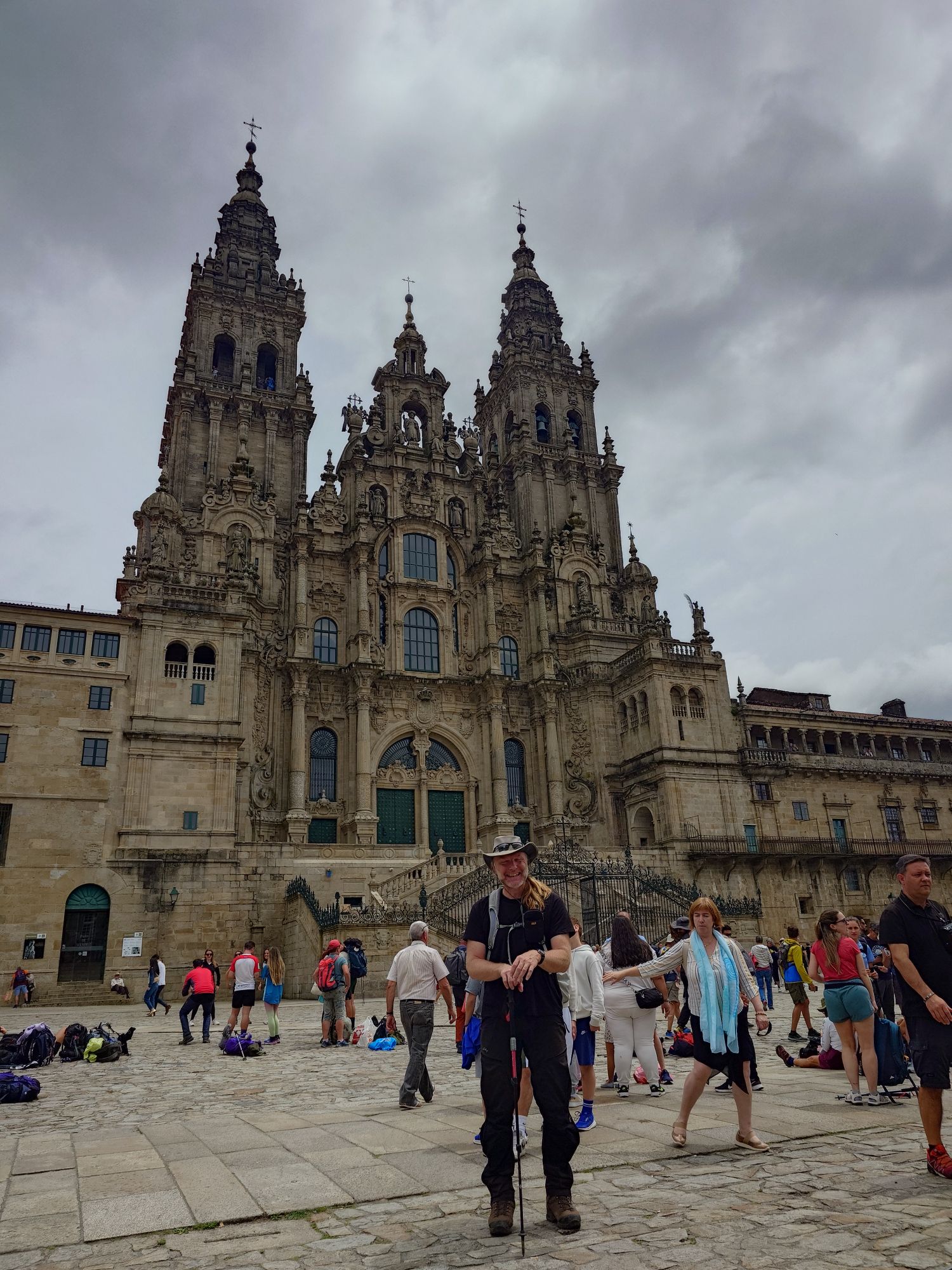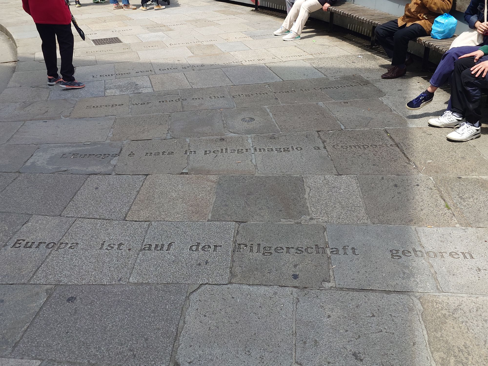 Heute morgen bin ich langsam losgelaufen. Ein übliches Frühstück mit Cafe con leche und Croissant im Ort, und dann Musik in die Ohren. In Lavacolla habe ich Rast an dem rituellen Waschplatz gemacht, die anderen Leute sind nur schnell an mir vorbei gehastet. Und dann auf dem Monte de Gonzo, der erste Blick auf die Kathedrale. Auch hier habe ich eine längere Rast gemacht. Die darauf folgenden letzten 5 Kilometer habe ich dann genossen. Den Berg hinunter, in die Stadt hinein. Durch den Vorort Richtung Innenstadt. Dann durch die Gassen Richtung Kathedrale. Der Dudelsackspieler im Torbogen zum Kirchenplatz war da, und auch mein Sitzplatz auf der Steinbank ganz rechts vom Platz war frei.
